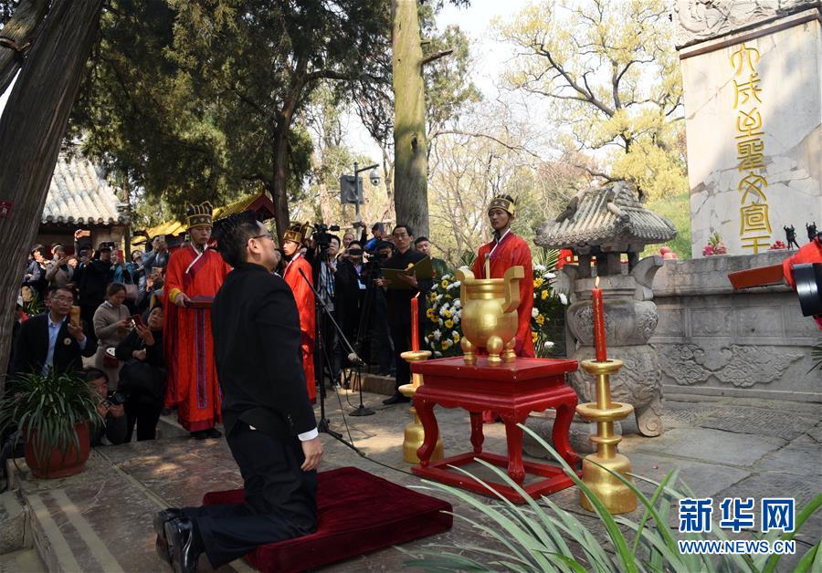 4月5日,孔子第79代嫡孙、正献官孔垂长(跪者)在祭拜孔子。 当日,在位于孔子故里山东曲阜的孔林,海内外400多名孔子后裔代表齐聚祖茔,共祭先祖。 新华社记者 王凯 摄