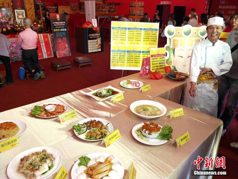 2019年,大甲妈祖首次驻驾台北。4月7日,大甲妈祖台北“行宫”南港区玉成新创中心举办祈福仪式。本次大甲妈祖驻驾台北将持续到4月底,其间还提供6场妈祖平安宴供信众订桌品尝,并有掷茭大赛、舞台表演等活动。当晚,台湾大甲妈祖绕境进香活动在台中市大甲镇澜宫正式启程。图为名厨林明灿(右)介绍妈祖平安宴菜式。中新社记者 毕永光 摄