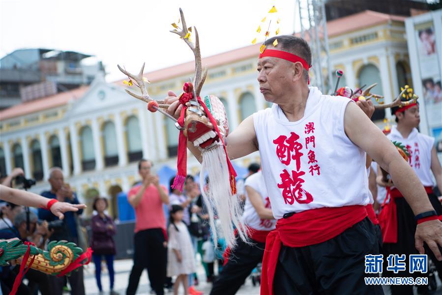 4月7日,演员在首届文化传播日活动上表演国家级非物质文化遗产——舞醉龙。 当日,澳门特区政府文化局在塔石广场举行首届文化传播日活动,以加强市民对文化传播理念的重视,推动文化传播工作,更好地传承中华传统文化。 新华社记者张金加摄