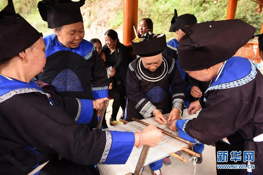 苗族群众在展示手工织布(4月6日摄)。4月6日至7日,在贵州省黔东南苗族侗族自治州剑河县观么镇新民村和新合村,来自剑河县和三穗县的苗族同胞欢聚一堂,通过民族歌舞展演、非遗手工艺展示、千户祭“巫耶”、跳芦笙舞等形式,与来宾一起欢庆2019年高雍苗族“三月三”民俗文化节。 新华社记者 杨文斌 摄
