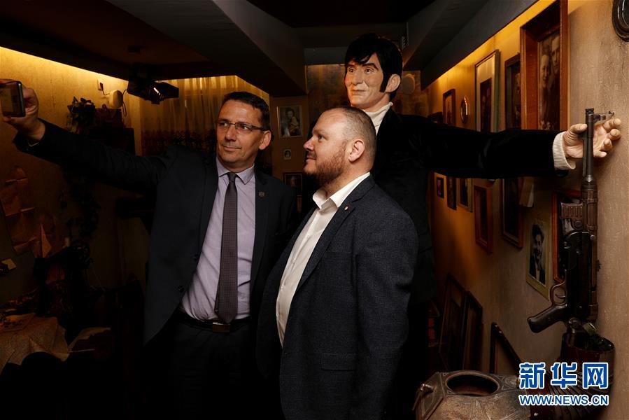 4月6日,在波黑首都萨拉热窝,参观者在《瓦尔特保卫萨拉热窝》博物馆与电影人物蜡像合影。新华社发
