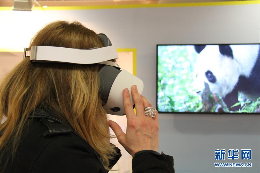 4月8日,在2019法国戛纳春季电视节上,一位观众在中国展台体验用VR设备观看一部关于大熊猫的纪录片。新华社记者 杨一苗 摄