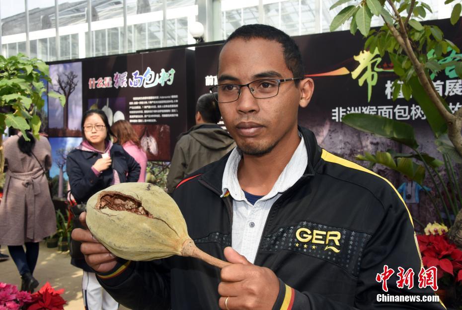 4月8日,中国科学院植物研究所举行媒体开放日介绍,北京最“古老”植物温室、也是新中国第一座热带亚热带植物展览温室——中国科学院植物研究所北京植物园展览温室,在完成整体修缮和设备更新后,即将于4月10日起全新开放。全新开放的温室收集展示2000余种热带亚热带植物,包括首次同时展出4种猴面包树、印度赠送中国的菩提树等。图为在中科院植物所就读博士的马达加斯加学生ROMER在温室内展示猴面包树果实。 中新社记者 孙自法 摄