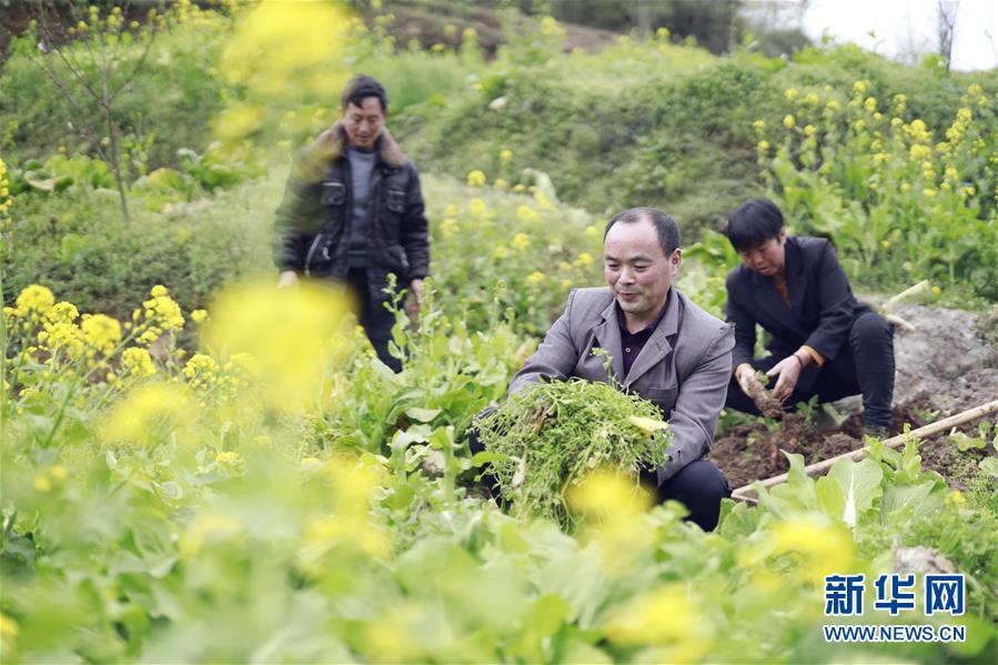 重庆市武隆区白马镇板桥村,杨兴勇(中)和家里人一起在地里干农活(3月27日摄)。新华社记者 刘潺 摄