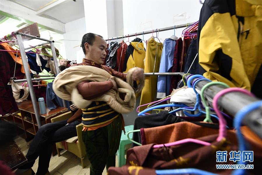 《印象武隆》剧场的更衣室内,杨兴勇在穿演出服(3月27日摄)。新华社记者 刘潺 摄