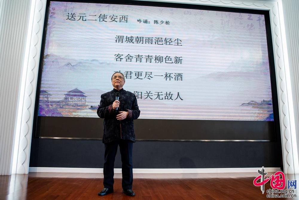 著名吟诵专家、南京师范大学老教授陈少松先生现场展示了吟诵《五柳先生传》《送元二使安西》,悠然古雅的吟诗声仿佛让大家穿越回了唐宋盛世。中国网记者 郑亮摄
