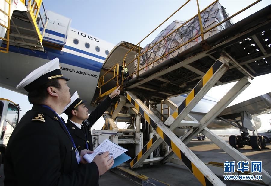 4月10日,在北京海关人员的现场监管下, 文物由航班货舱卸下。新华社发(陈寅嵩摄)