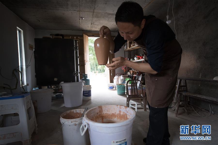 4月10日,刘杰在浙江龙泉市兰巨乡大汪村“在山堂”工作室给瓷坯上釉,釉料也为他自己上山取材配制。