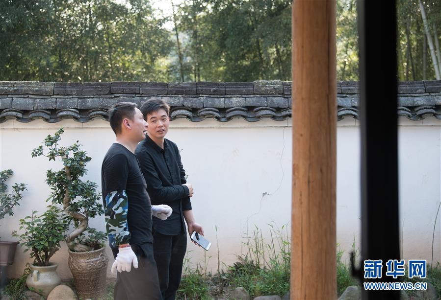 4月10日,在浙江龙泉市兰巨乡大汪村“在山堂”工作室,刘杰(左)和前来学习柴烧的建窑艺人王东凯讨论烧制技法。新华社记者 翁忻旸 摄
