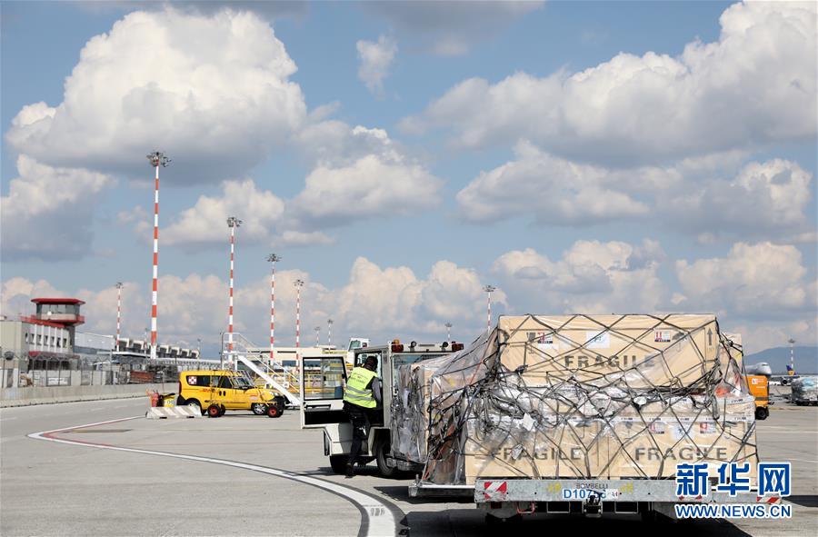 4月9日,在意大利米兰马尔彭萨机场,工作人员将打包好、按规格装到集装板上的中国流失文物艺术品运输到停机坪。 新华社记者 程婷婷 摄