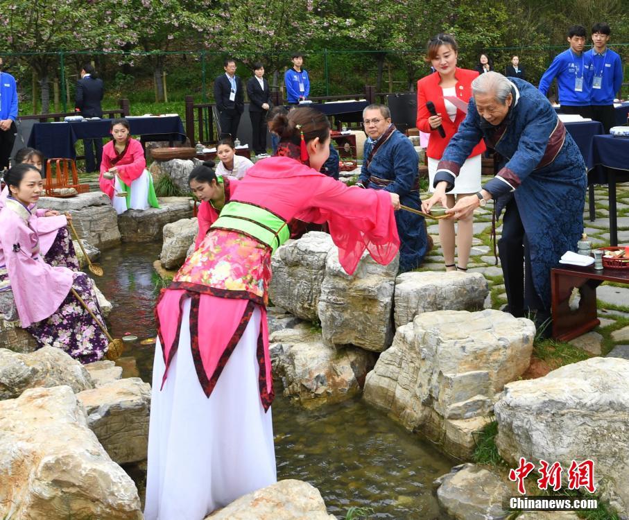 第三十五届兰亭书法节4月10日在浙江绍兴开幕,海内外书法名家等1000余人云集,泼墨挥毫、交流书艺,重温千年兰亭之经典、中华书法之灿烂。海内外书法家身着晋朝服饰,在清溪边品酒、赋诗、挥毫,再现“群贤毕至,少长咸集”的曲水流觞盛况。东晋永和九年,王羲之等42位名人雅士修褉兰亭,吟诗挥毫,妙笔写就《兰亭集序》。为纪念和传承这一历史际会,自1985年以来,绍兴便举行一年一度的兰亭书法节,今年已是第三十五届。中新社发 袁云 摄