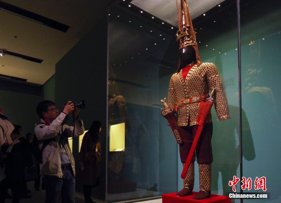 4月11日,“殊方共享——丝绸之路国家博物馆文物精品展”在北京中国国家博物馆开幕。图为哈萨克斯坦共和国国家博物馆藏“‘金人’服饰和武器(复原)”。中新社记者 贾天勇 摄