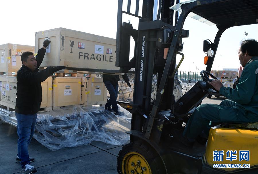 4月10日,物流运输人员将通关后的文物装车。 新华社记者 李贺 摄
