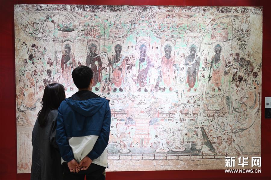 4月10日,参观者在展览上观摩壁画《药师经变》。 新华社记者秦晴摄