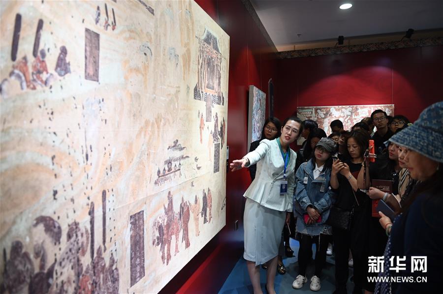 4月10日,敦煌研究院文化弘扬部的讲解员马琳(左)为参观者仔细讲解壁画文化。 新华社记者秦晴摄