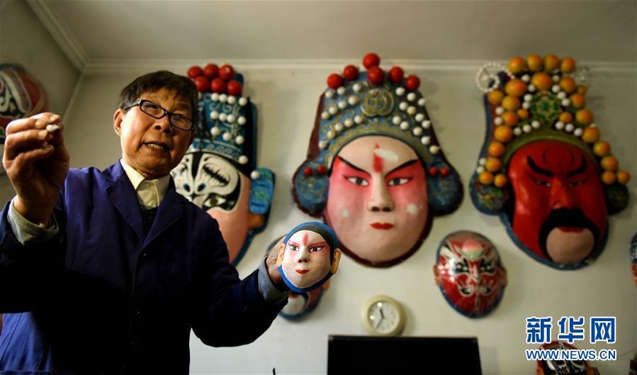 4月12日,张智在家中介绍脸谱创作过程。82岁的老艺人张智是河北省石家庄市新华区一名退休干部,退休后开始学习脸谱手工制作技艺,在25年时间里完成制作京剧脸谱千余张。近年来,张智走进社区、学校和企事业单位传授脸谱制作技艺,让更多的人了解这门艺术,感受传统民族文化的魅力。 新华社发(陈其保 摄)