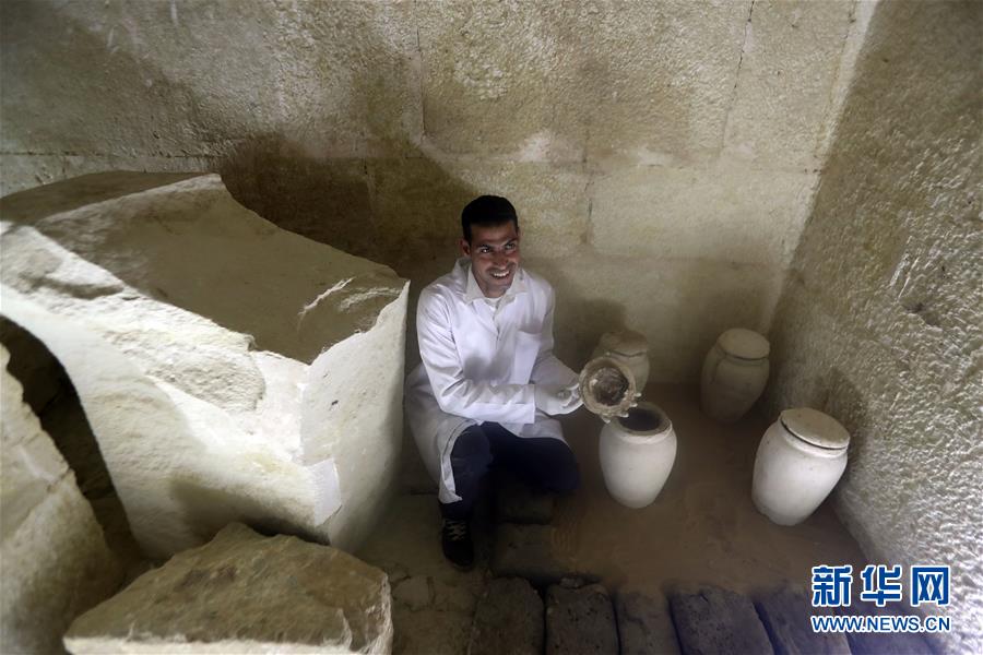 4月13日,在埃及首都开罗以南约30公里的塞加拉地区,一名考古人员在墓葬内工作。13日,埃及文物部组织媒体参观了近日在首都开罗以南约30公里的塞加拉地区发现的一座第五王朝时期的贵族墓葬。埃及文物部发布的声明说,该金字塔位于杰德卡雷金字塔旁,是迄今为止发现的古王国时期最大的王后金字塔。 新华社发(艾哈迈德·戈马摄)