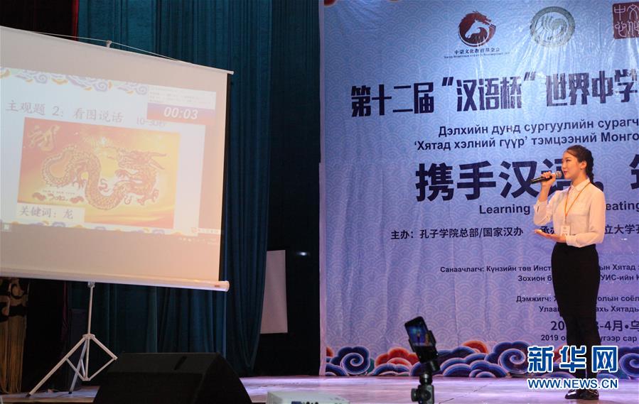 4月13日,在蒙古国首都乌兰巴托,选手诺敏额尔登参加第十二届“汉语桥”世界中学生中文比赛蒙古国大区赛决赛。 以“携手汉语,筑梦未来”为主题的第十二届“汉语桥”世界中学生中文比赛蒙古国大区赛决赛13日在乌兰巴托举行。 新华社发(苏力雅摄)