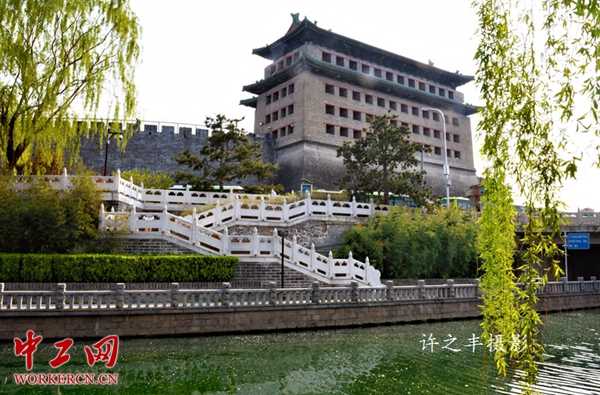 北京德胜门,始建于明正统二年(1437年),明清北京城内九门之一。是由城楼、箭楼、闸楼和瓮城等组成的群体军事防御建筑。之所以取名叫德胜门,遇到战事自德胜门出兵,预示“旗开得胜”之意。明清两代,德胜门正面迎击来自北方的军事入侵,是北京城最重要的城防阵地,这里曾经发生过著名的北京保卫战。图为2019年4月11日的北京德胜门。工人日报-中工网许之丰摄影报道