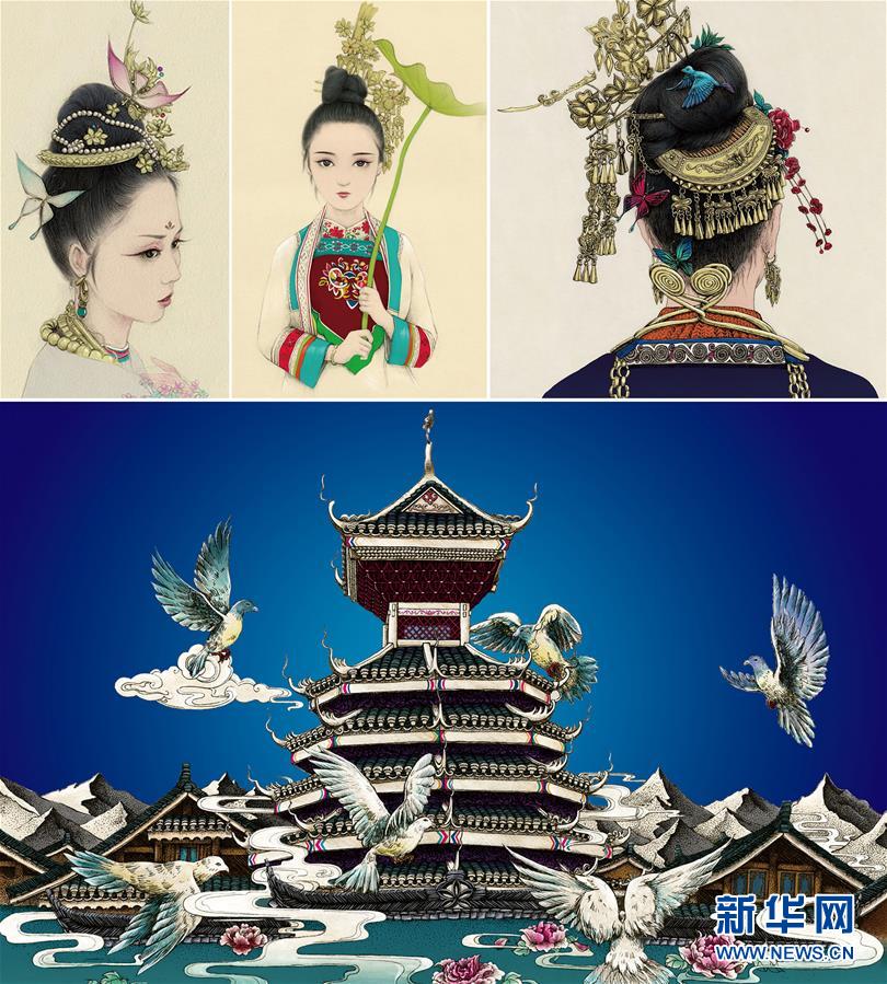 兰才生的插画作品拼图(作者本人提供)。 28岁的侗族青年兰才生,2015年大学毕业后回到家乡贵州黎平,在肇兴侗寨内创立“兰才生插画馆”,以苗族侗族的少数民族文化为主题,创作插画,开发衍生文创产品。画风细腻的艺术插画在当地小有名气,受到海内外游客的肯定。“以插画的形式,让贵州的少数民族文化被更多人喜欢和了解是我最大的心愿。”兰才生说。 新华社发