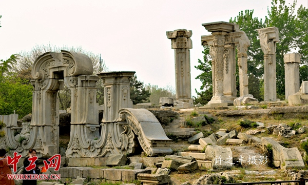 圆明园又称圆明三园,是清代大型皇家园林,它坐落在北京西北郊,与颐和园毗邻,由圆明园、长春园和绮春园组成,所以也叫圆明三园。1860年10月英法联军抢劫并纵火焚烧圆明园。而谴责最深的是《巴黎圣母院》的作者维克多·雨果(雕塑图)。1983年北京市定名为“圆明园遗址公园”。图为2019年4月17日的圆明园遗址。工人日报-中工网许之丰摄影报道