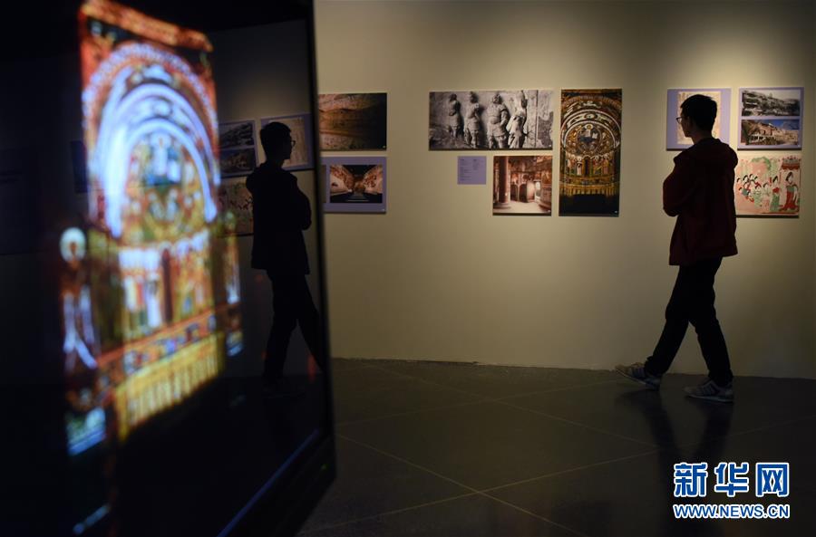 4月17日,游客在敦煌莫高窟欣赏“朝圣之路·圣迹——从敦煌到伊比利亚半岛”展览。 新华社记者 马宁 摄