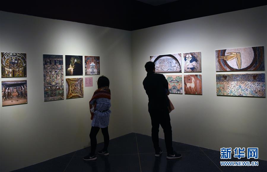 4月17日,游客在敦煌莫高窟欣赏“朝圣之路·圣迹——从敦煌到伊比利亚半岛”展览。新华社记者 马宁 摄