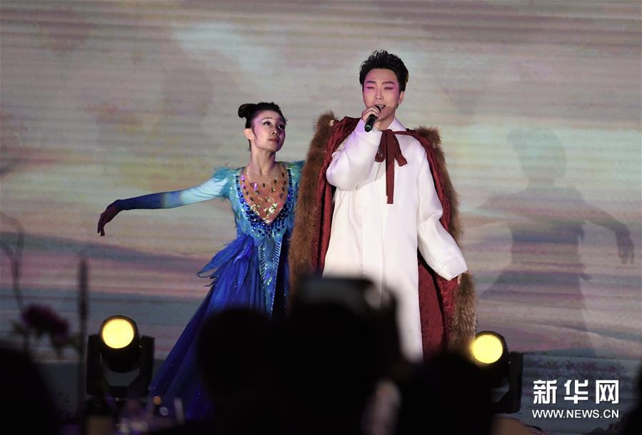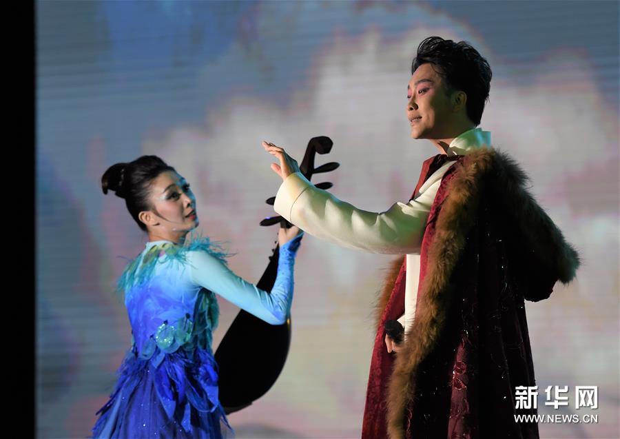 4月18日,李玉刚(右)与剧中演员在启动仪式现场表演《昭君出塞》片段。 新华社记者 罗晓光 摄
