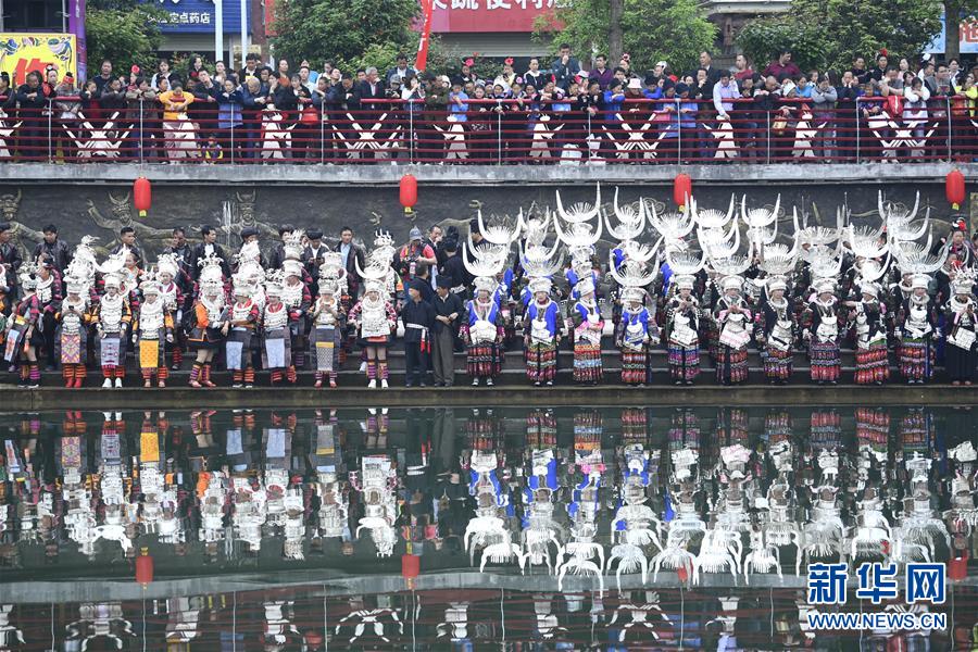 当日,贵州省黔东南苗族侗族自治州台江县万名苗族同胞欢聚翁你河畔,以传统对唱的方式欢庆苗族姊妹节。