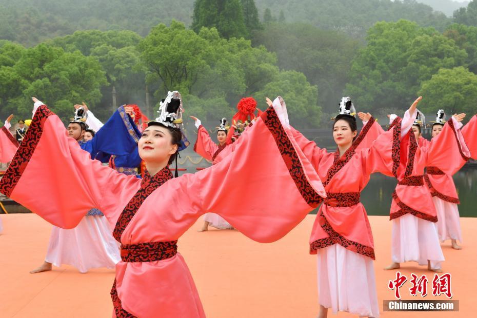 4月20日,2019年公祭大禹陵典礼在浙江绍兴大禹陵祭祀广场举行。图为演员在2019年公祭大禹陵典礼上表演。中新社发 袁云 摄