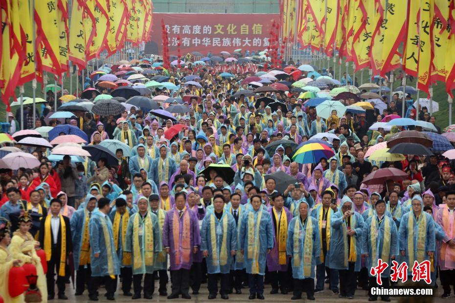 4月20日,由中国公共关系协会、陕西省文化和旅游厅、渭南市人民政府主办的2019 “一带一路”年度汉字发布活动,在仓颉故里陕西白水举行。“共”字最终成为2019“一带一路”年度汉字。此次汉字推选运用微信、微博、H5等新媒体、自媒体传播方式,经过一个多月的全媒体初推、官网推介等形式,最终发布推出。2019“一带一路”年度汉字发布活动结合白水传承千年的谷雨祭祀仓颉的传统文化礼仪,发布仪式通过舞台剧、国画等艺术形式,诠释2019“一带一路”年度汉字的精神和底蕴。舞台剧《汉字美立方之共生共荣》融合了影像、舞蹈和音乐等形式,演绎出汉字的创造与传承,展现出人与自然是共生共荣的生命共同体。最后舞蹈演员通过肢体,组合成2019“一带一路”年度汉字“共”字,展现汉字之美,将活动推向高潮。本次活动还邀请了著名的“汉字叔叔”——来自美国的理查德?西尔斯(Richard Sears)先生亲临现场。图为社会各界人士冒雨出席活动。中新社记者 任海霞 摄