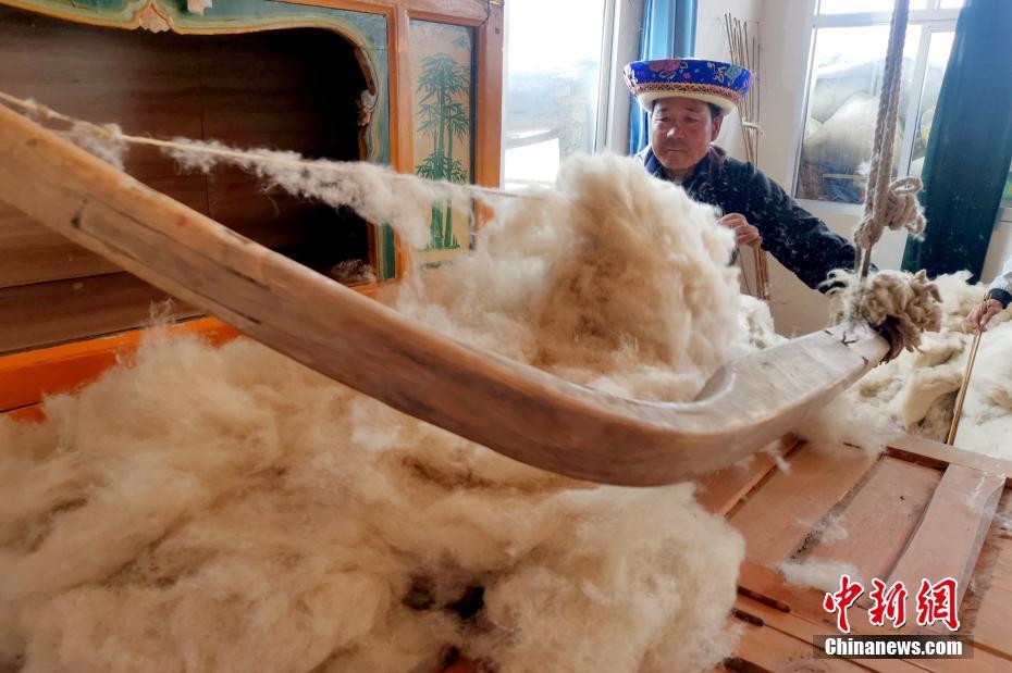 4月19日,擀毡艺人进行弹毛。青海省互助土族自治县的土族擀毡技艺是省级非物质文化遗产项目,土族手工艺人使用羊毛、牦牛毛等原材料,经过的弹毛、铺毛、喷水、卷毡帘、压边、洗毡等十几道工序,将其制成土族人家嫁娶习俗中必不可少的毡毯。每个步骤都是手工完成,一张毡多用12斤羊毛,由2至3人耗时两天才能完成。中新社记者 李隽 摄