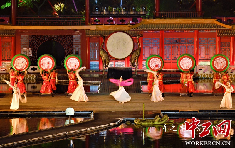 2019年4月19日晚,江苏扬州市一场舞台剧《春江花月夜》坐落于风景如画的瘦西湖畔。喜欢扬州的美,因为烟花时节百花齐放,色彩斑驳;喜欢扬州的静,因为瘦西湖一泓碧玉的湖水,如梦似幻;喜欢扬州的雅,因为久仰“月亮城”的盛名;现如今,更喜欢扬州的“夜”的,因为瘦西湖畔上演着《春江花月夜·唯美扬州》。该剧依托扬州深厚的历史文化和秀丽的自然风光,深入挖掘扬州的古老传说和神话,力求原汁原味地再现江南园林风情,展现扬州美丽多姿的自然景观和人文魅力。工人日报-中工网许之丰摄影报道