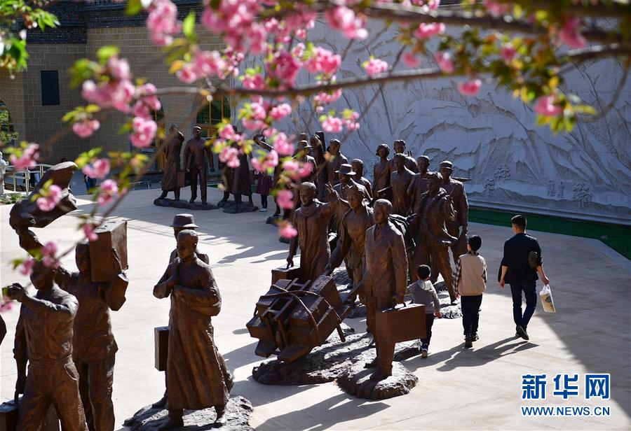 4月21日,游人在延安市南门广场参观。近日,陕西省延安市春光明媚,宝塔山下的南门广场花开正盛,吸引众多市民前来写生游玩。新华社记者 邵瑞 摄