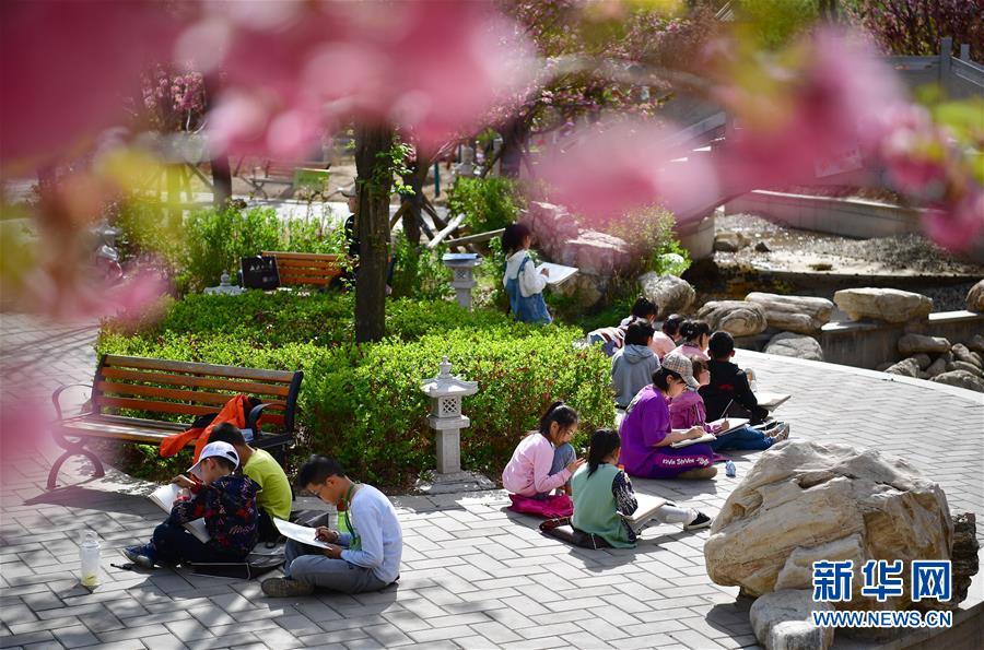 4月21日,小朋友和老师一起在延安市南门广场写生。近日,陕西省延安市春光明媚,宝塔山下的南门广场花开正盛,吸引众多市民前来写生游玩。新华社记者 邵瑞 摄