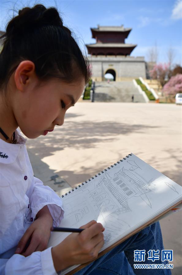 4月21日,小朋友在延安市南门广场写生。近日,陕西省延安市春光明媚,宝塔山下的南门广场花开正盛,吸引众多市民前来写生游玩。新华社记者 邵瑞 摄