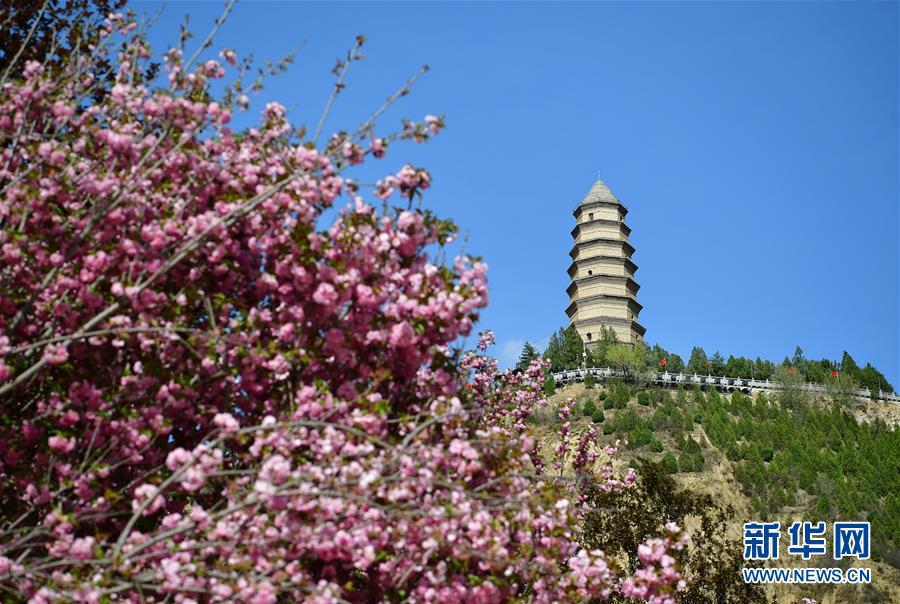 鲜花掩映下的延安宝塔山宝塔(4月21日摄)。近日,陕西省延安市春光明媚,宝塔山下的南门广场花开正盛,吸引众多市民前来写生游玩。新华社记者 邵瑞 摄