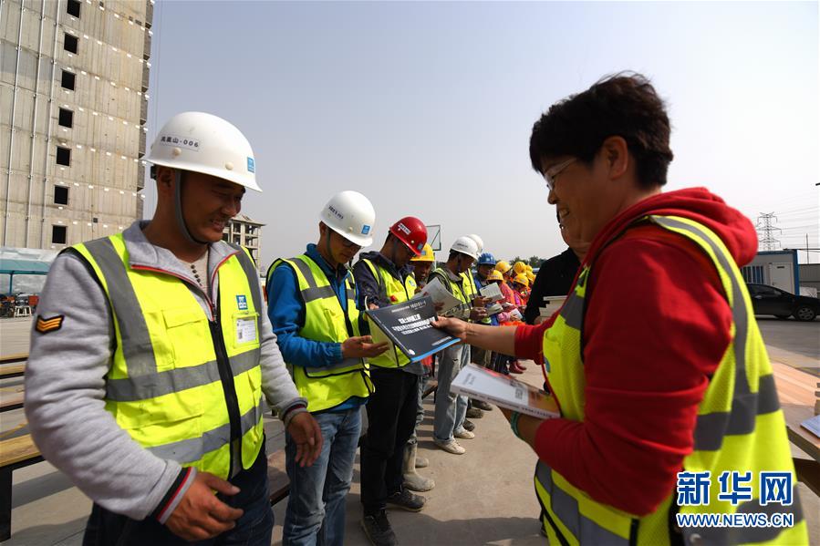 4月21日,志愿者在读书会现场为建筑工人赠书。 当日,中建二局三公司在北京亦庄一处项目工地举行“品味书香世界,悦读智慧人生”读书会,请志愿者现场分享阅读体验并为建筑工人赠书,共迎世界读书日。 新华社记者 任鹏飞 摄