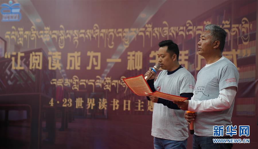 4月21日,西藏英语角的志愿者次仁云丹(左)和次旦多吉在朗诵英文诗歌。 当日,来自西藏社会各界的读者在西藏自治区图书馆内汇聚一堂,讲故事、朗读经典、畅谈阅读体会,共迎世界读书日。 新华社记者 晋美多吉 摄