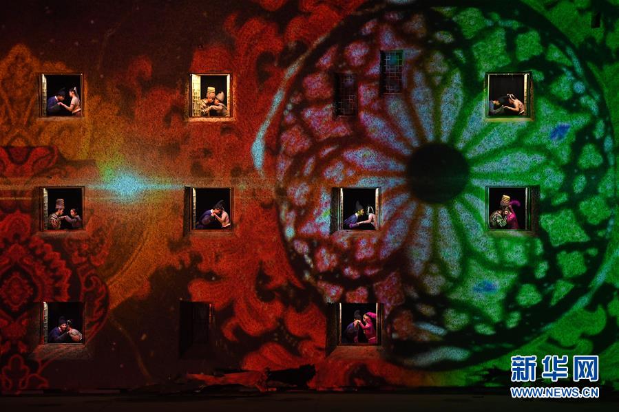 4月21日,演员在沙漠实景剧《敦煌盛典》中表演。 随着旅游旺季的临近,升级了灯光和舞美效果的沙漠实景剧《敦煌盛典》近日在甘肃省敦煌市“新貌”迎客。该剧以敦煌鸣沙山月牙泉为背景,将沙漠景观与现代舞美结合,将墙体灯光融入实景演出,全剧分6个篇章,讲述了一段发生在古丝绸之路重镇敦煌的爱情故事,展示了敦煌的历史文化及人文风貌。 新华社记者 范培珅 摄
