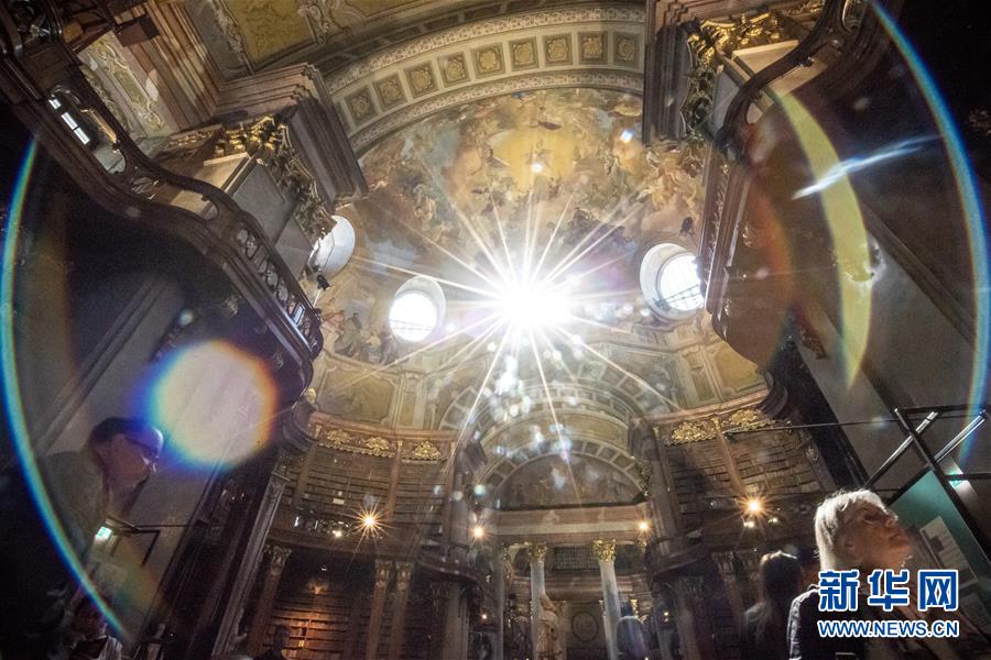 4月18日,在奥地利维也纳,阳光透过屋顶的窗户照进奥地利国家图书馆的普隆克厅。