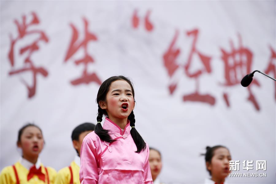 2019年4月22日,贵州省黔东南苗族侗族自治州剑河县举办2019年世界读书日全县中小学生“经典诵读”比赛活动,来自全县21所中小学的学生现场诵读了《三字经》《千字文》《唐诗三百首》等国学经典。 新华社记者 杨文斌 摄