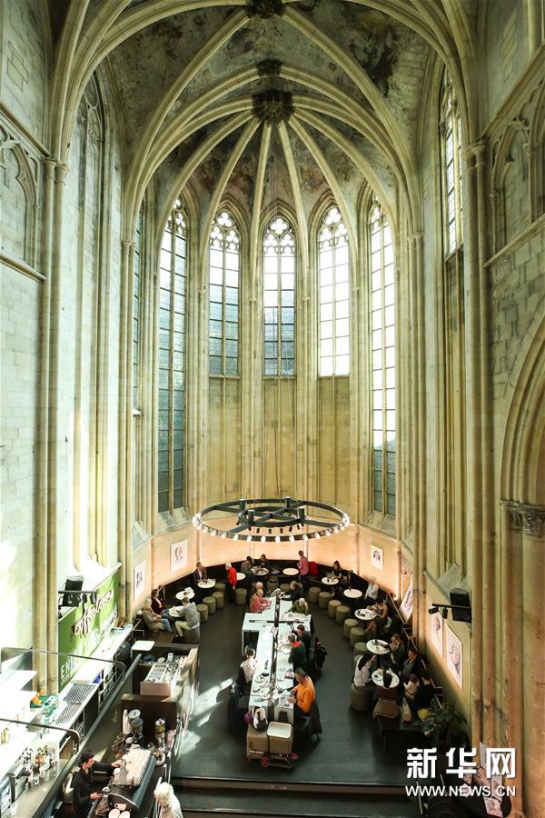 这是4月16日拍摄的荷兰马斯特里赫特多米尼加书店餐饮区。