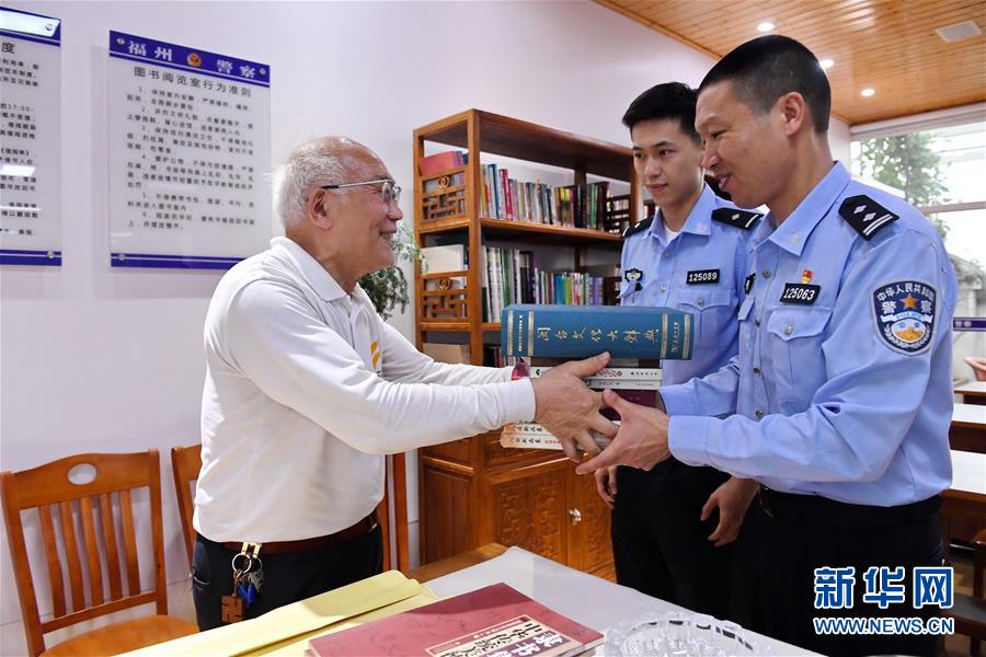 4月22日,林玉山(左一)在他帮助建立的福州市公安局上街(高新区)分局怡山派出所图书室向该所民警代表阮树强(右一)等赠送书籍。新华社记者林善传摄