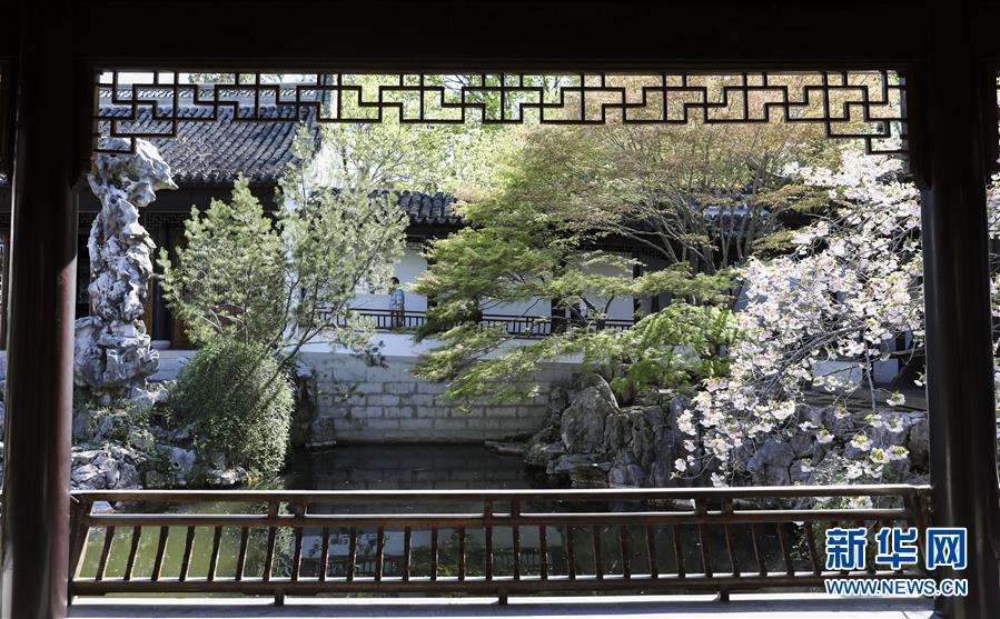 4月23日,游人在位于美国纽约斯塔滕岛的寄兴园内参观。 天气转暖,位于纽约斯塔滕岛的中国苏式园林寄兴园内春花盛开,生机盎然。 新华社记者 王迎 摄