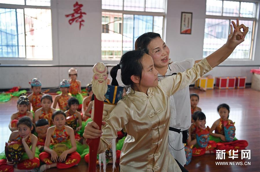 4月23日,在江西省南丰县教师进修学校附属小学,指导老师给孩子们示范傩舞的动作。 新华社记者 万象 摄