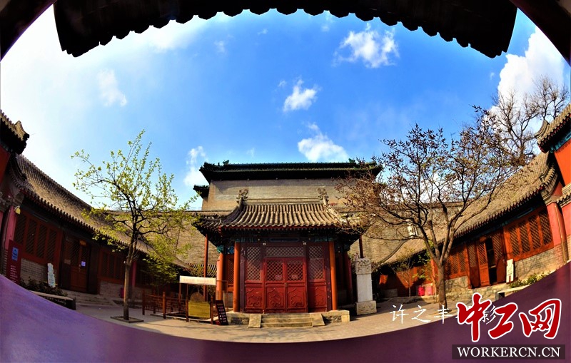 北京德胜门真武庙位于城门瓮城北部,箭楼之下,建于明万历年间。庙宇坐北朝南,分东、中、西三路,中路院内钟鼓楼分立左右,三间正殿前出抱厦,两侧各有配殿,整座庙宇布局紧凑。真武即玄武,是北方之神,具有龟蛇缠绕的形象。真武崇拜兴起于宋元,明代达到极盛。德胜门真武庙解放初期被拆,1992年开始复建,现成为古代钱币展览馆。图为2019年4月12日的真武庙景色。工人日报-中工网许之丰摄影报道