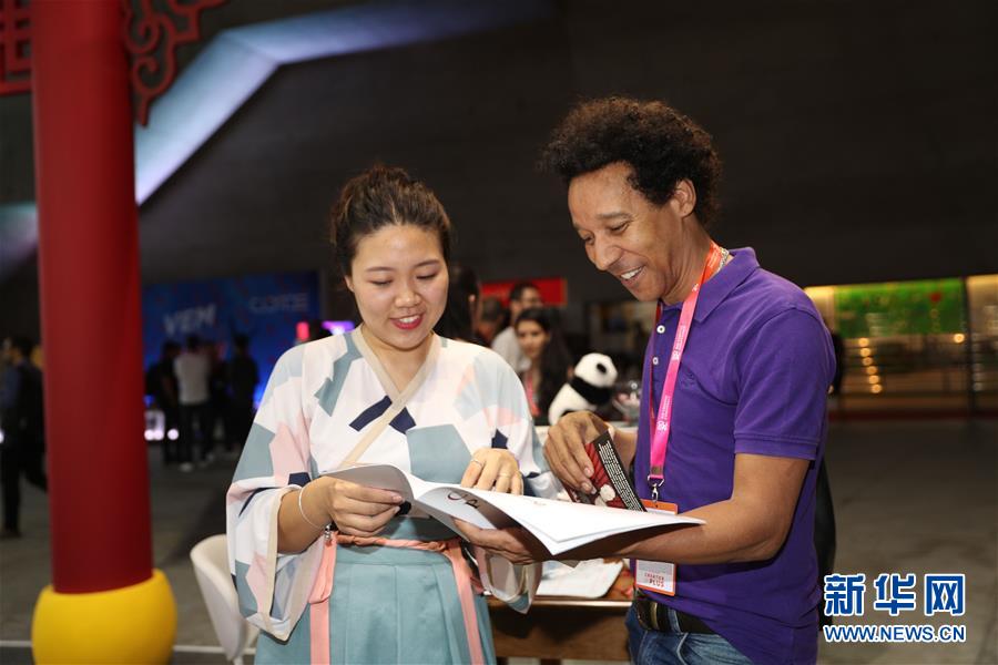 4月24日,在巴西里约热内卢艺术城,一名与会者(右)在中国展台翻阅宣传册。 新华社记者李明摄