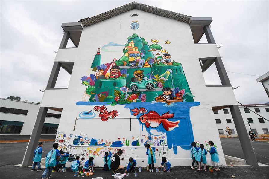 4月25日,孩子们在艺术园区创作墙绘。近日,来自各地的艺术家及艺术院校学生在浙江省杭州市淳安县大墅镇“自由野艺术园区”内进行创作,为即将在5月初正式开放的艺术园区做准备。2019年年初,淳安县大墅镇启动乡村文创产业园建设,将10000多平方米的老旧厂房进行屋顶维修、外立面改造和园区道路改造,让老旧厂房变身为山乡小镇艺术园区。根据规划,该艺术园区将开设艺术家工作室、艺术品展览区,并成为艺术院校师生的创作、实践基地,推动当地美丽乡村的文创产业和乡村旅游业发展。 新华社记者 徐昱 摄