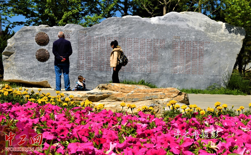 北京劳模广场,位于北京明城墙遗址公园西侧,是北京市总工会设立。为在全社会大力弘扬“劳动光荣”价值理念和敬业风气。石碑按年代铭刻了1950年至2015年的1197名北京市历届全国劳动模范和全国先进工作者共名录。以“劳模墙”为传承载体,弘扬劳模精神、劳动精神、工匠精神。图为2019年4月25日的北京劳模广场。工人日报-中工网许之丰摄影报道